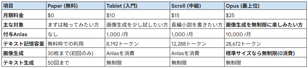 NovelAIには、無料トライアルとして機能のお試しができる「Paperプラン」から、用途に応じた3つの有料プラン(Tablet、Scroll、Opus)が用意されています。