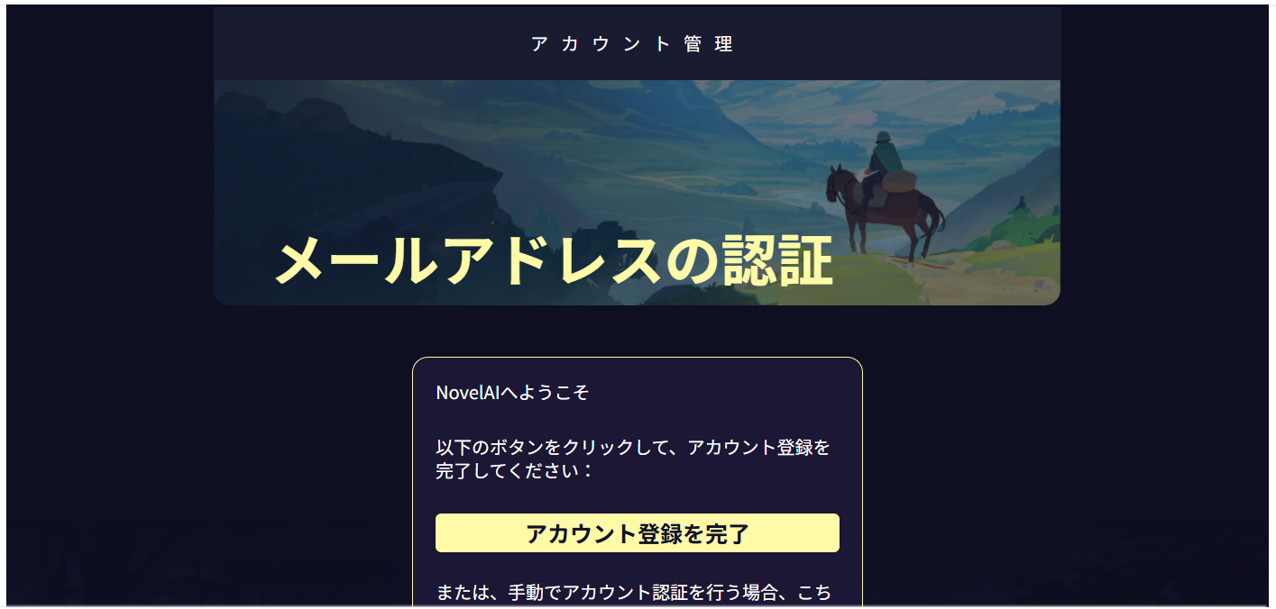 入力が完了して登録ボタンを押すと、指定したメールアドレス宛にNovelAIから確認のメールが送信されてきます。