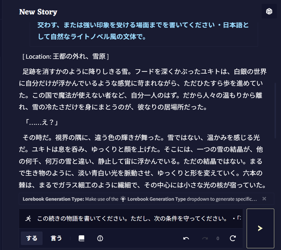 ここに物語の導入部分や、キャラクター同士の最初の会話を少し書き込むと、AIがその文脈や雰囲気を読み取り、見事な続きの文章を自動で生成してくれます。