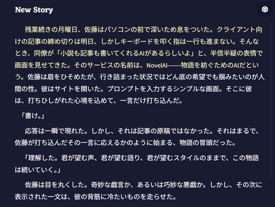 残業続きの月曜日、佐藤はパソコンの前で深いため息をついた。クライアント向けの記事の締め切りは明日、しかしキーボードを叩く指は一行も進まない。そんなとき、同僚が「小説も記事も書いてくれるAIがあるらしいよ」と、半信半疑の表情で画面を見せてきた。そのサービスの名前は、NovelAI――物語を紡ぐためのAIだという。