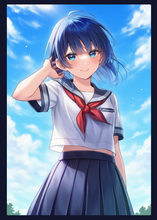 突き抜けるような美しい青空を背景に、少し照れたような表情の制服の少女が表示されており、プロンプトに入力した要素は達成できています。