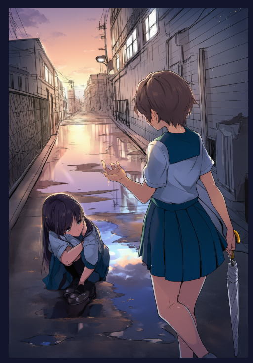 雨上がりの路地で、傘を持った女子高生(source1)が、膝をついて座り込んでいる友人(target1)に手を差し伸べるという想定で生成します。