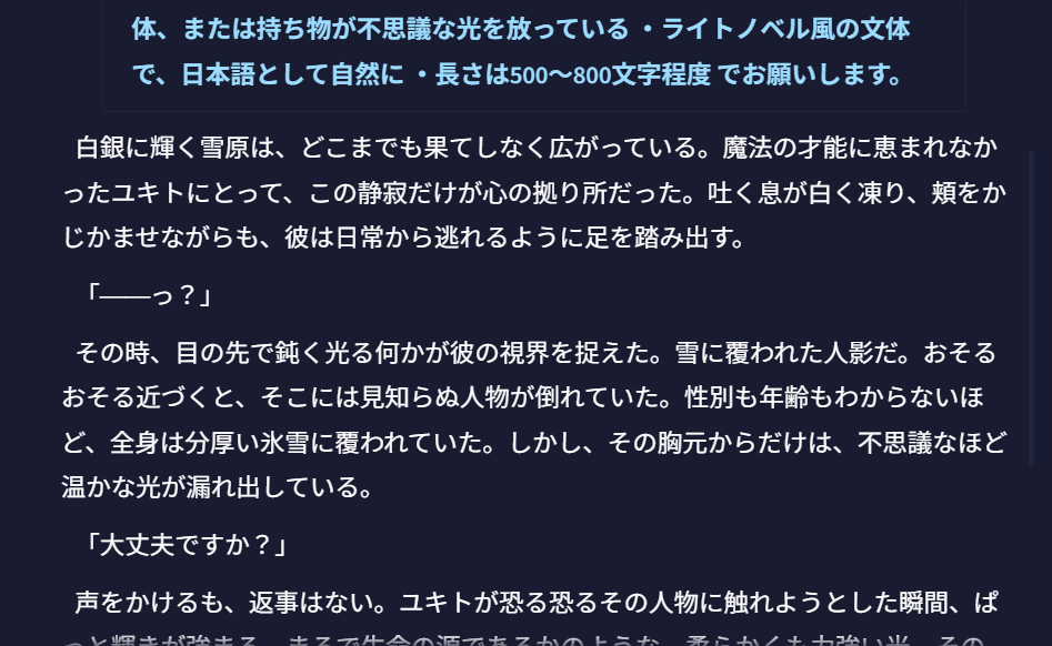 次に、「魔法が使えない少年が、雪降る王国で不思議な出会いをする」というシナリオを用意し、無料の範囲内でどのような物語冒頭のバリエーションをつくれるかを検証してみました。