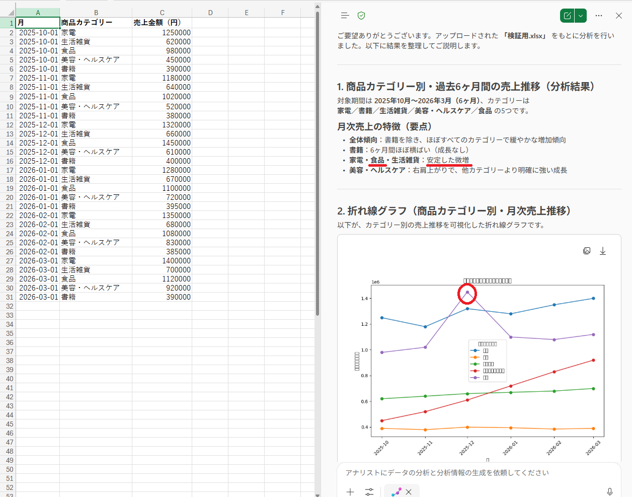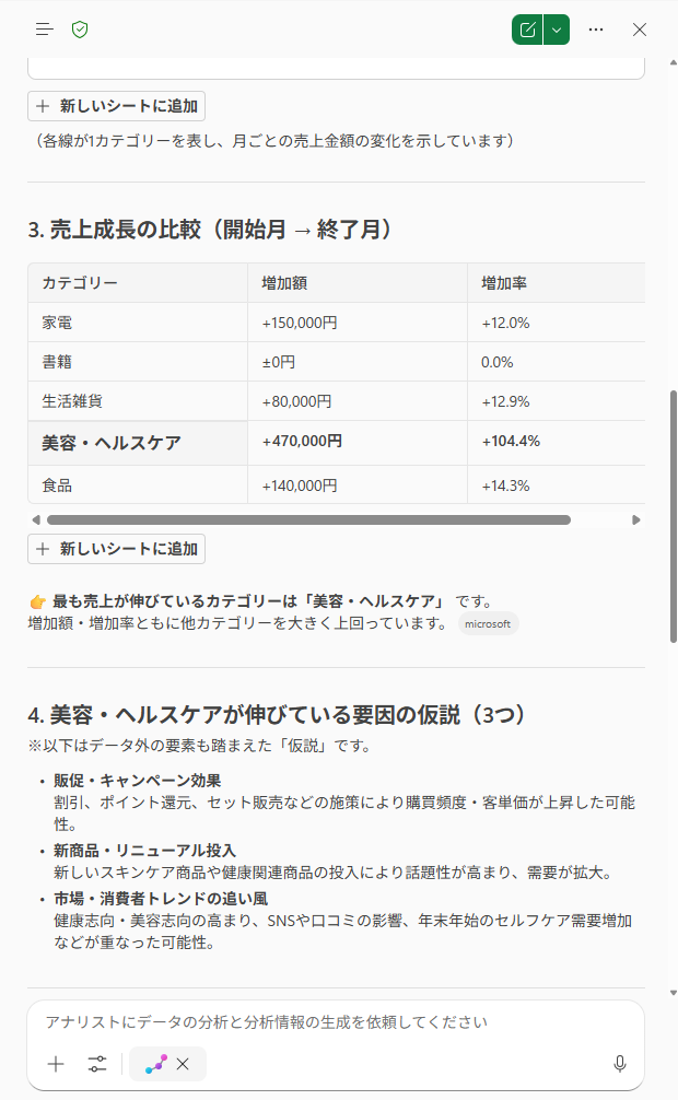 一方で、指示に含まれていない情報の分析精度には課題が残ります。例えば、食品ジャンルで明らかな売上の伸びがある月でも「安定した微増」と片付けられてしまうケースがありました。また、作成されたグラフの凡例で文字化けが発生することもあるため、グラフ自体を作成する際は「Copilotで編集」機能を活用してExcelシート上に直接描画させる方が確実です。 Analystはあくまでデータの傾向を読み解く「分析ツール」としてメインで活用し、グラフ作成は別の機能で補完する使い方がおすすめです。