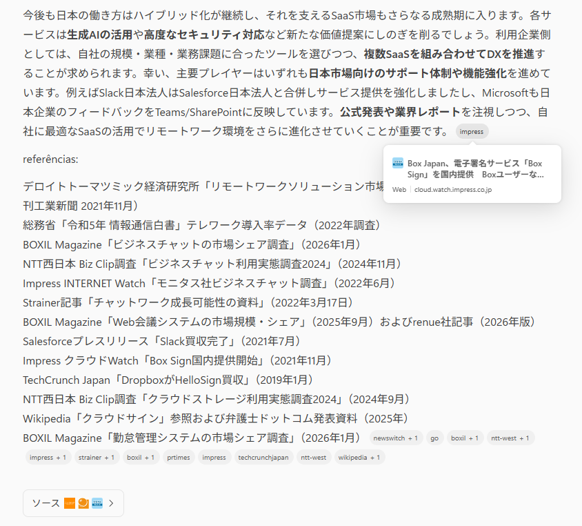 ただし、情報の鮮度については注意が必要です。最新の動向までリサーチできているものの、出力結果は2020年〜2024年までの5年間の内容となっており、前年度(2025年)の情報が反映されていませんでした。 より最新のデータを重視したい場合は、プロンプトで対象期間を明確に指定するなど、意図した結果を引き出すための工夫が求められます。