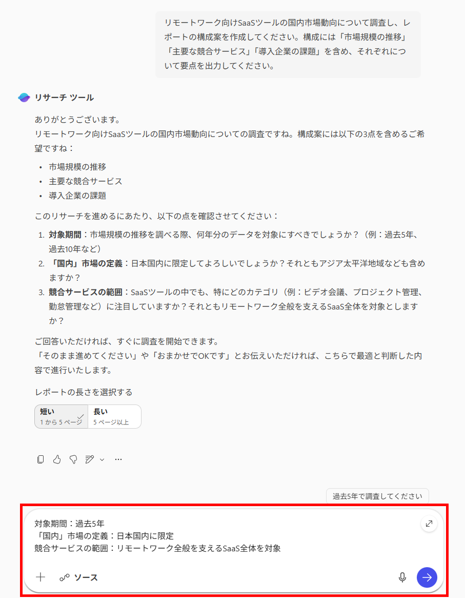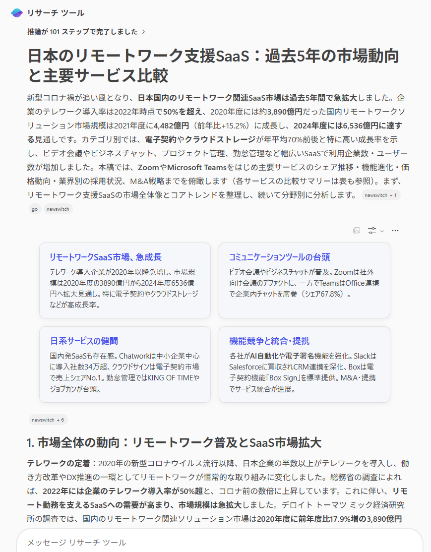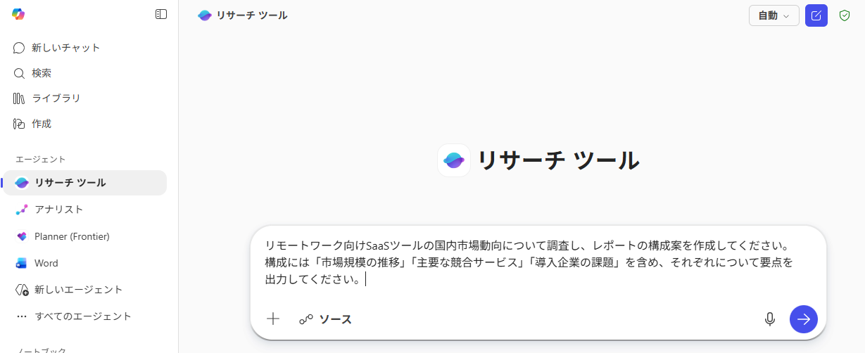 Researcherを活用した市場調査のドラフト作成 Researcherエージェントは、指定されたテーマに関する情報を広範囲から収集し、構造化された調査レポートを作成します。 競合調査や市場動向の把握など、リサーチ業務の初期段階の負担軽減につながります。