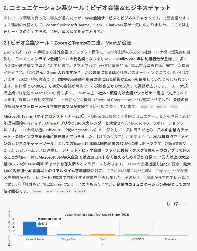 約8分30秒で11,000文字以上の網羅的なリサーチ結果が出力された 太字やグラフが自動追加され、流し読みでも要点を把握しやすい 情報ソースが明記されており、ファクトチェックや深掘りをしやすい 情報の鮮度にタイムラグがある場合があり、プロンプトでの工夫が必要 Researcherエージェントを用いた市場調査レポートの作成では、約8分30秒で11,000文字を超える調査結果が出力されました。文章量が膨大であるものの、指示した内容が網羅的にまとめられているだけでなく、太字での強調やグラフによる視覚化が施されているため、要点を流し読みで把握しやすい構成になっています。さらに、情報のソース(出典)が文中の各所や文末に一覧で明記されている点も大きなメリットです。これにより、ファクトチェックをスムーズに行ったり、気になる情報をさらに深掘りしたりする際に役立ちます。