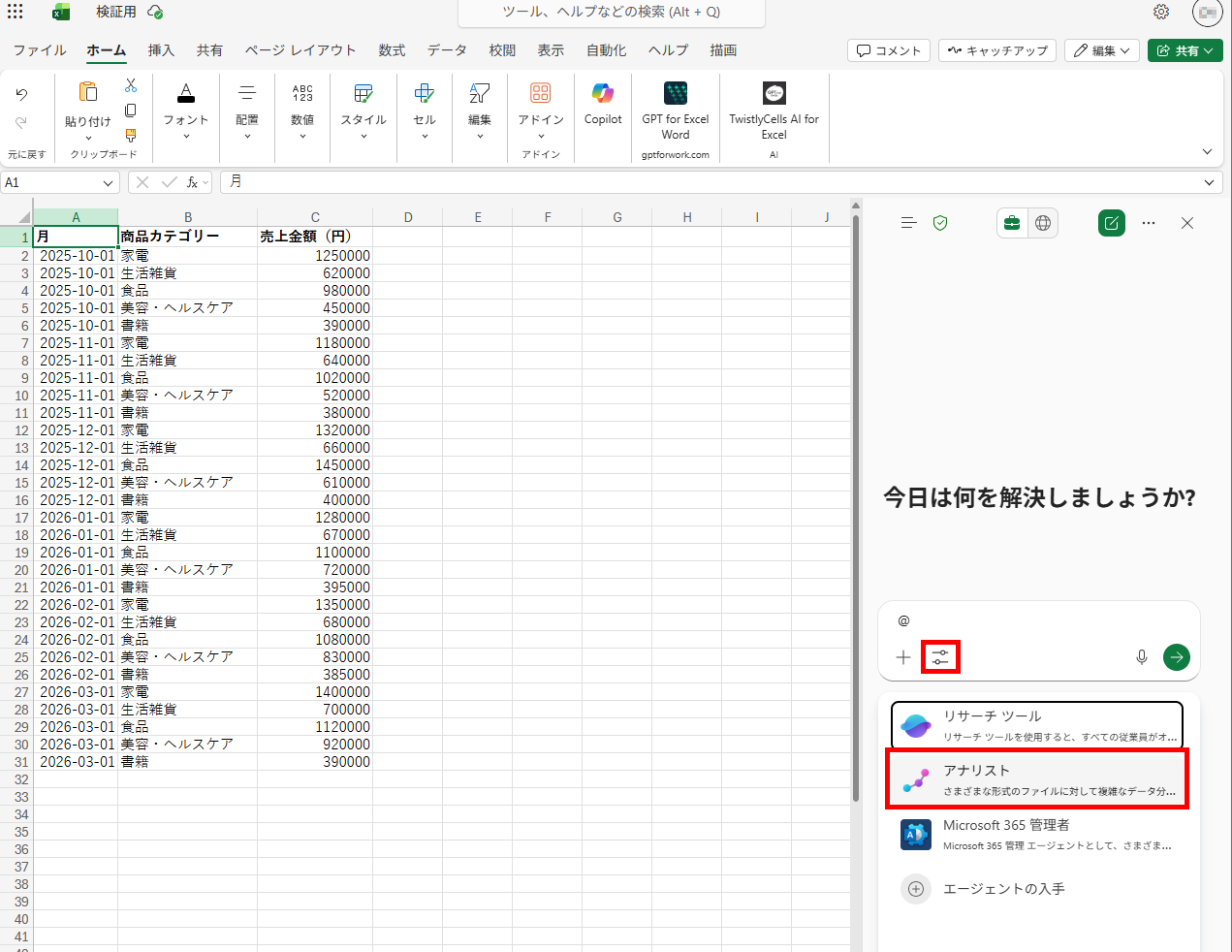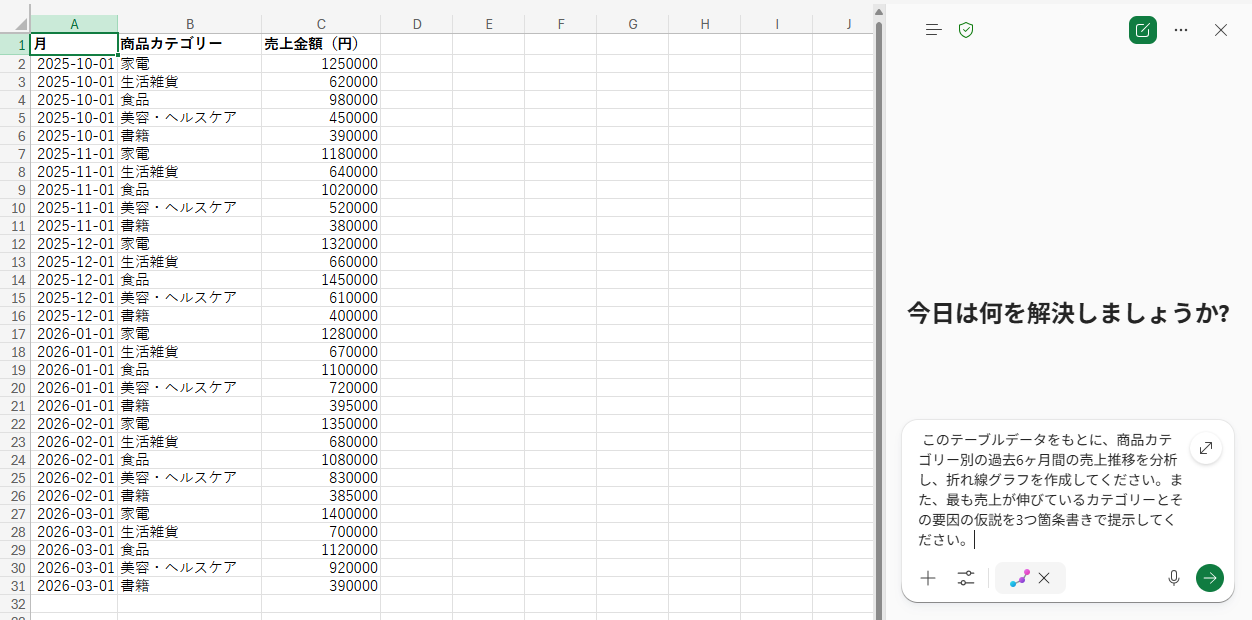 検証1:ExcelとCopilotの組み合わせで売上データをグラフ化してみた 商品カテゴリーごとの月次売上データが入力されたExcelファイルを用意し、Copilotを用いて傾向の分析とグラフ作成の自動化を検証します。データを用意したらCopilotを開き、ツールから「Analyst(アナリスト)」を選択します。