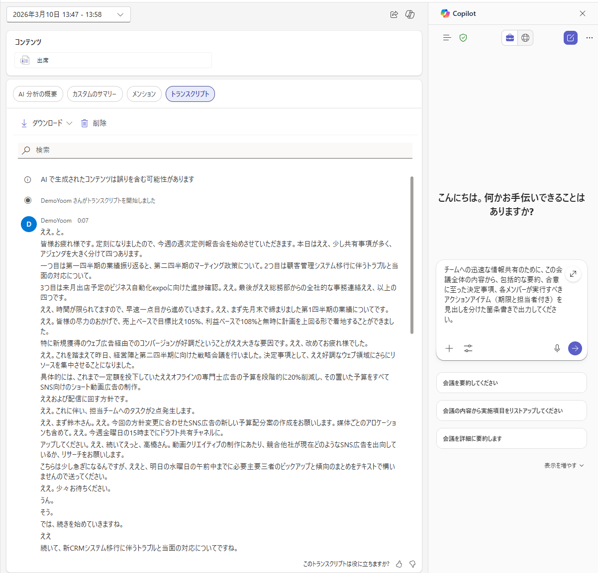 実体験3:会議終了後の議事録作成 最後の検証として、会議が終了した直後に、Copilotを使って議事録を作成します。 検証2で行った会議の終了後、会議の要約ページでCopilotを開き、議事録を作成しました。