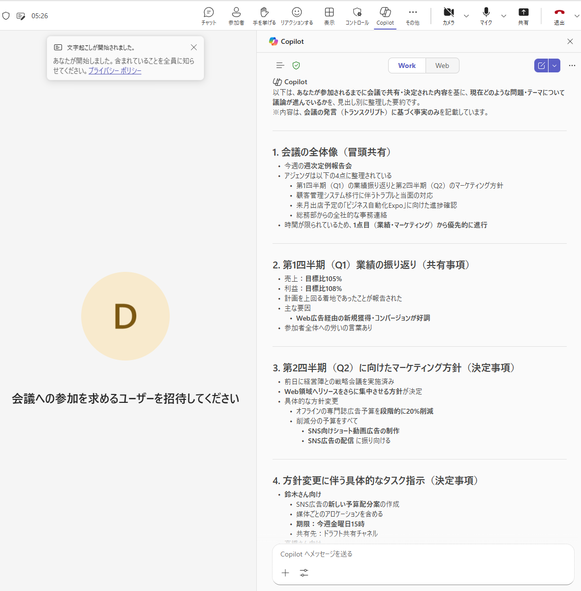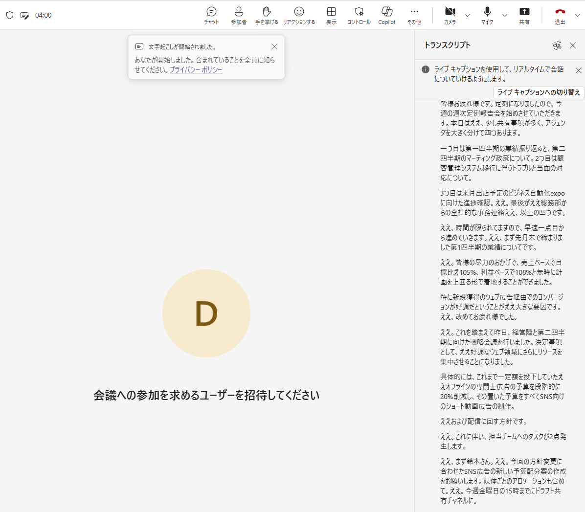 実体験2:途中参加した会議のキャッチアップ 続いて、途中で会議に参加したときに、それまでの内容をスムーズに把握できるかを検証しました。 会議は、以下のように文字起こしをオンにした状態で行いました。