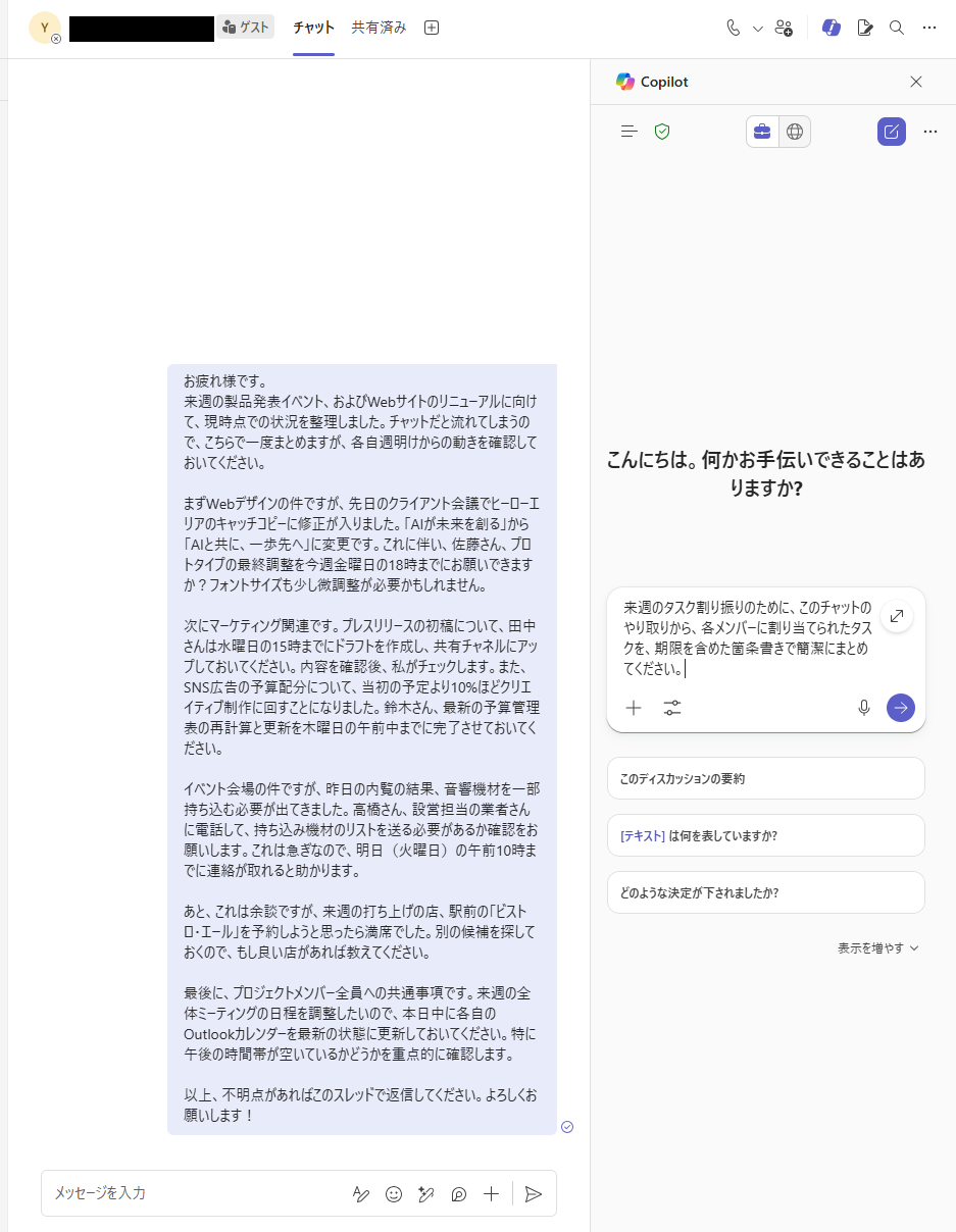 実体験1:チャットから「決定事項とタスク」を抽出 チャット内の情報を素早く把握できるかを試してみました。 あらかじめ、複数のメンバーへ向けたメッセージを送信しておき、その内容を抽出してもらいます。
