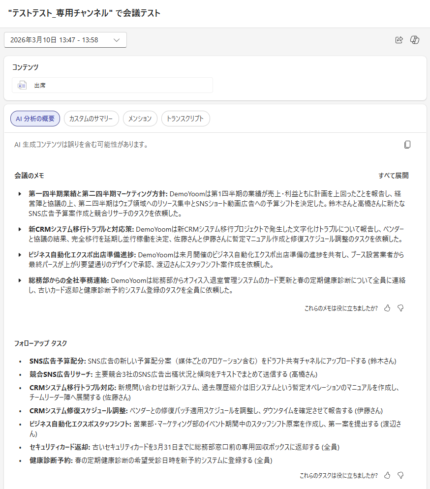 【会議の要約ページ】 ※以下の「AI 分析の概要」は、会議終了後に自動生成されたものです。 今回は、下記とは別でCopilotを使って、議事録を作成しました。