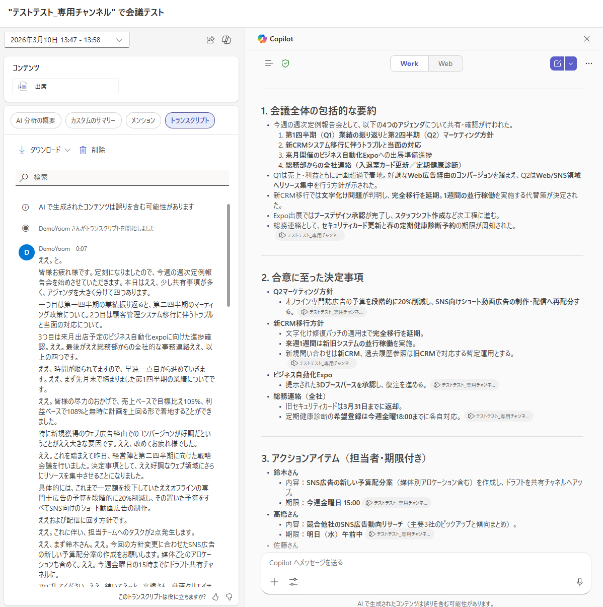 会議に途中参加した際のキャッチアップにおいて、Copilot in Teamsが非常に優秀なアシスタントとして機能することがわかりました。 通常、遅れて会議に参加すると「今は何の話をしていますか?」と周囲に確認する必要がありますが、Copilotを活用すれば進行中の会話を遮る必要がありません。 これにより、参加時の心理的なハードルや情報ロスが大きく軽減されます。 さらに、トランスクリプト(文字起こし)の精度も特筆すべき点です。文脈上の数値はもちろん、日本語の会話内に混じる「EXPO」といった英単語も自然に認識し、正確にテキスト化されていました。 また、「決定事項だけを抽出して」といった具体的な指示にも対応できるため、限られた時間でもスムーズに議論の要点を把握し、会議に入ることができます。