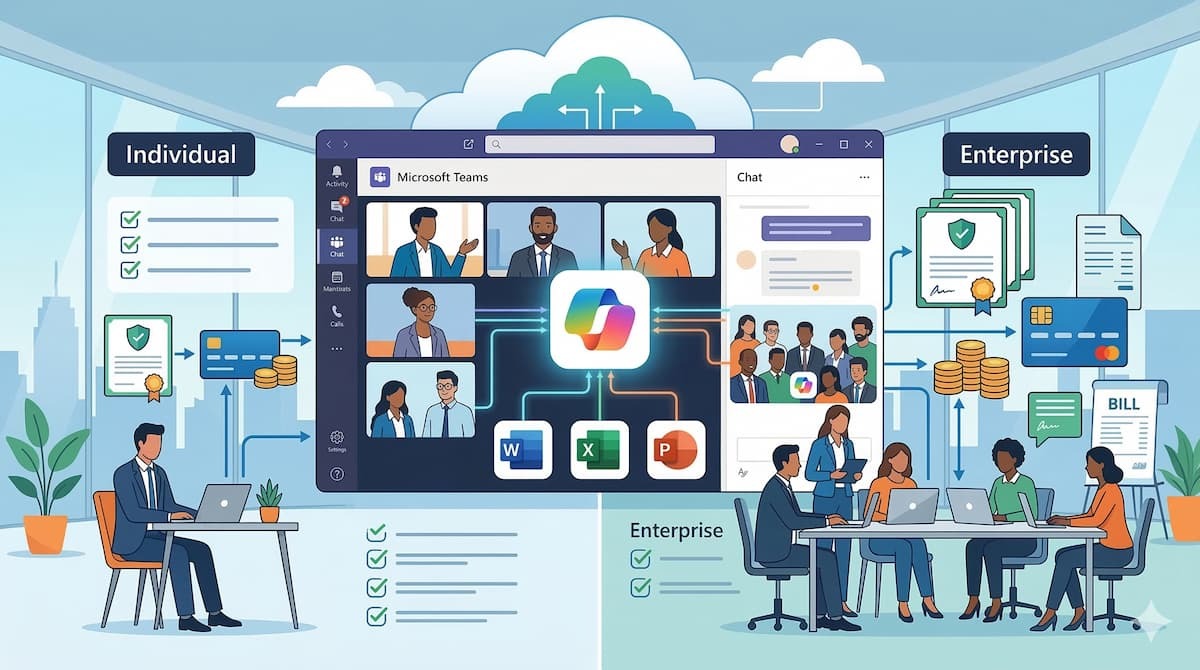 Microsoft TeamsでCopilotを活用するためには、対象となるMicrosoft 365のライセンス契約が必要です。 料金体系や利用できる機能の制限は、個人向けと企業向けで異なります。 ここでは、個人利用と企業利用それぞれにおける必須ライセンスや料金設定、および利用条件について解説します。