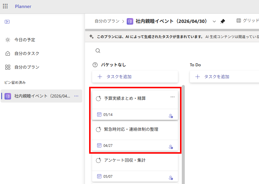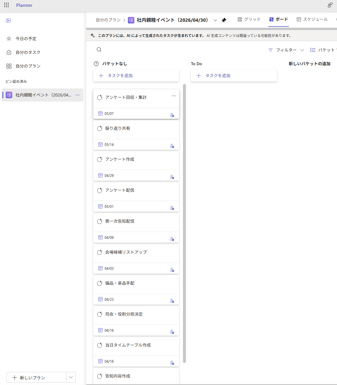 そのため、Plannerで新たにプロジェクトを作成後、再度生成してもらったタスクを登録するように依頼しました。 その結果、無事にプロジェクト内にタスクが自動で登録されました。