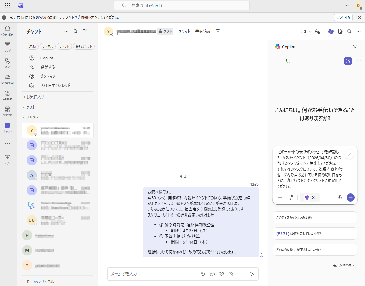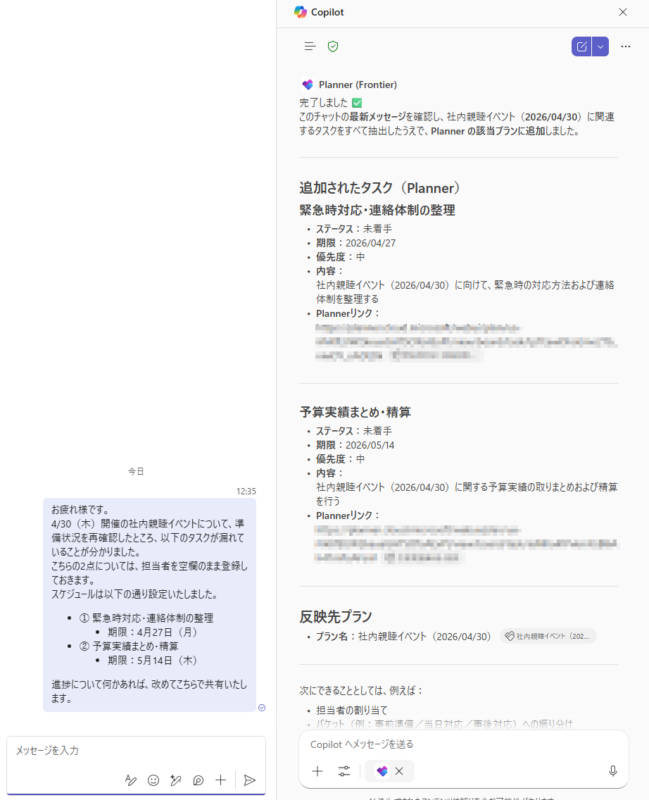 チャット内容からタスクを抽出し、Plannerへ自動登録できる