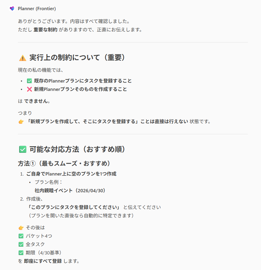しかし、Copilot ChatのPlannerエージェントではプロジェクトの新規作成ができないと返されました。