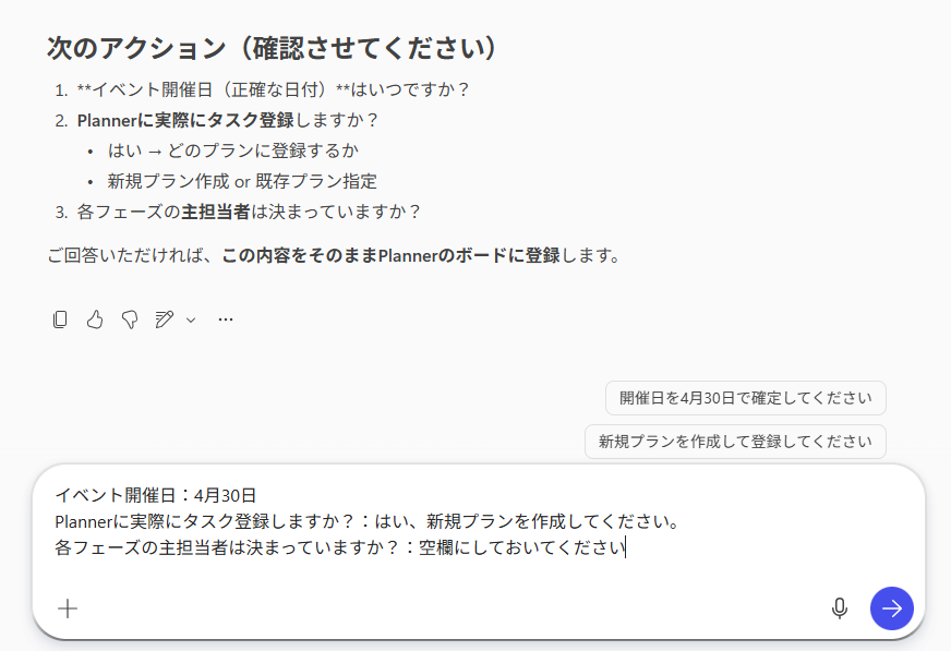 ここからは、実際にCopilotを日常の業務でどのように活用できるのか、実践的な検証結果をご紹介します。 今回は、Plannerエージェントを使ったプロジェクトの立ち上げと、Teamsのメッセージを起点としたタスク管理の2つのケースを試しました。