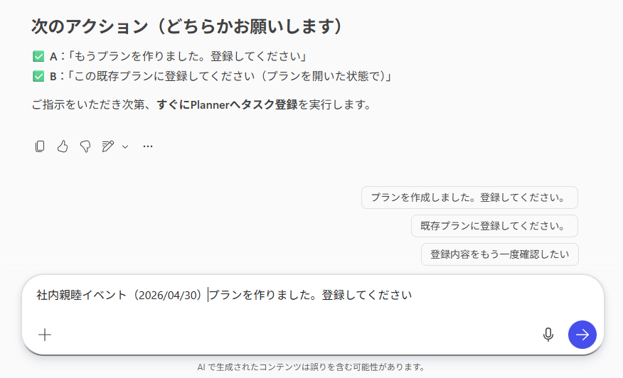 今回はCopilot ChatのPlannerエージェントを利用して、架空の「社内イベント企画」をテーマに、必要なタスクやスケジュールをAIに提案してもらいます。 手動でタスクを1つずつ入力する手間がどれだけ省けるかを確認しました。