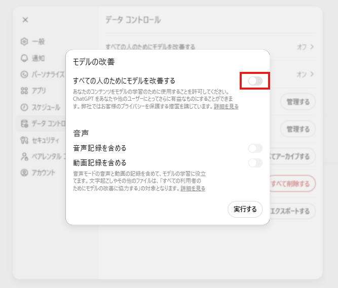 設定の変更:設定画面から「すべての人のためにモデルを改善する」をオフ(オプトアウト)にする。