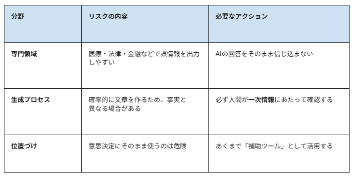 AI特有のハルシネーション(もっともらしい嘘)のリスクを考慮し、人間による最終確認の必要性を説いています。