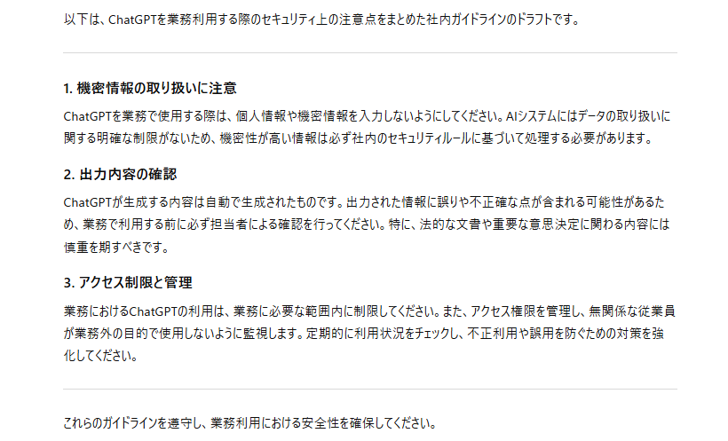 ChatGPTを業務利用する際のセキュリティ上の注意点を3つ、社内ガイドラインのドラフトとして作成してください。その際、『正直に言うと』『まとめると』などのAI特有の定型文を一切使わず、人間の担当者が書いたような自然で簡潔なトーンで出力してください。また、事実に基づかない架空の仕様を含めないでください。