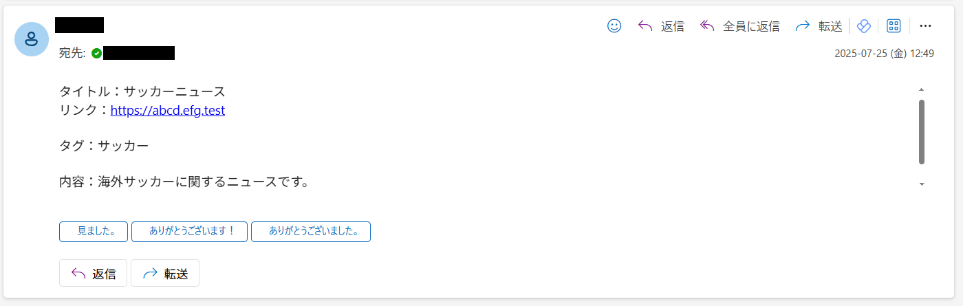 ここまでの設定が済んだら、指定したフォルダへ、キーワードを含むメールをテスト送信してください。