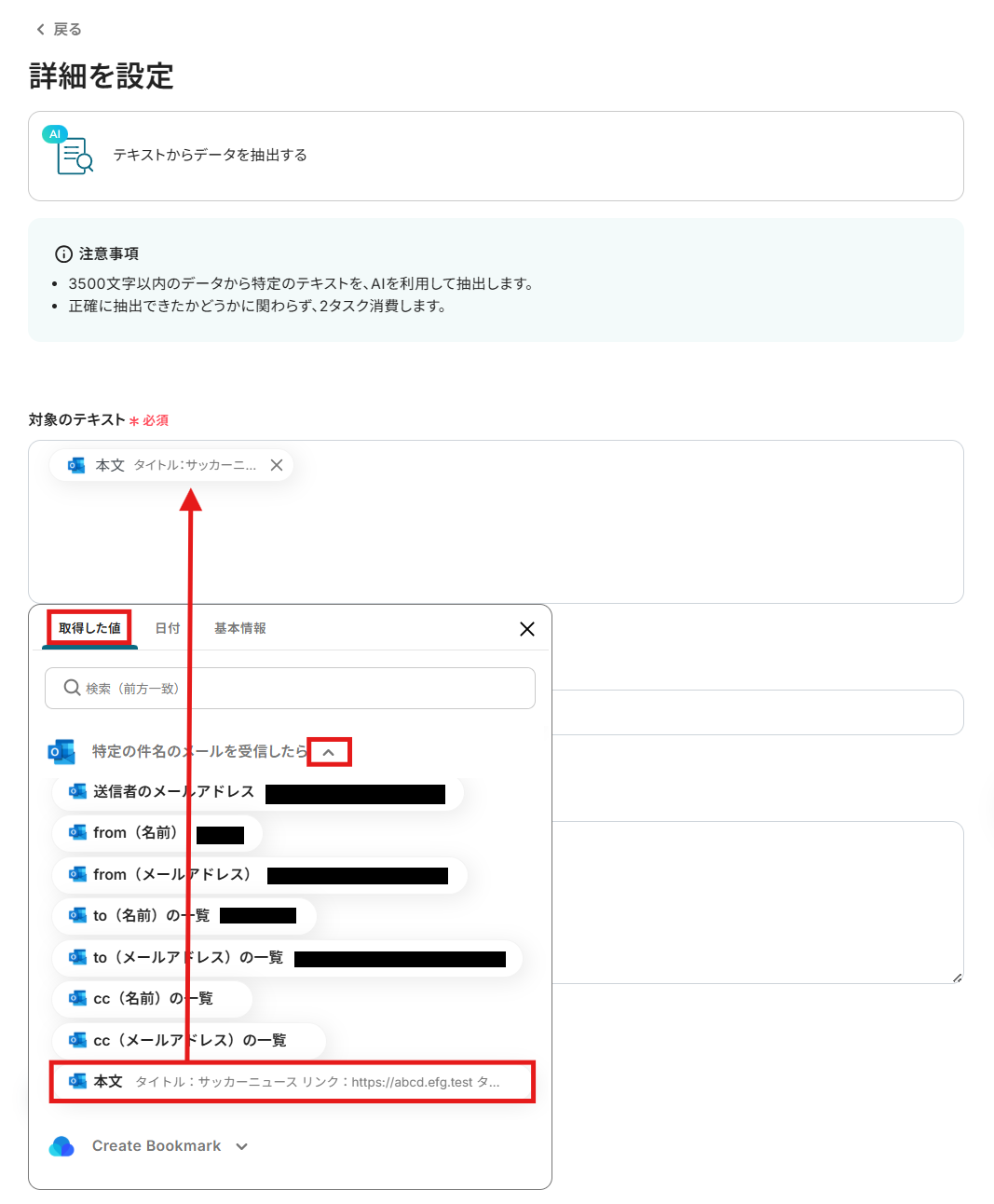 対象のテキストに、Outlookのトリガーアクションで取得した「本文」を設定します。