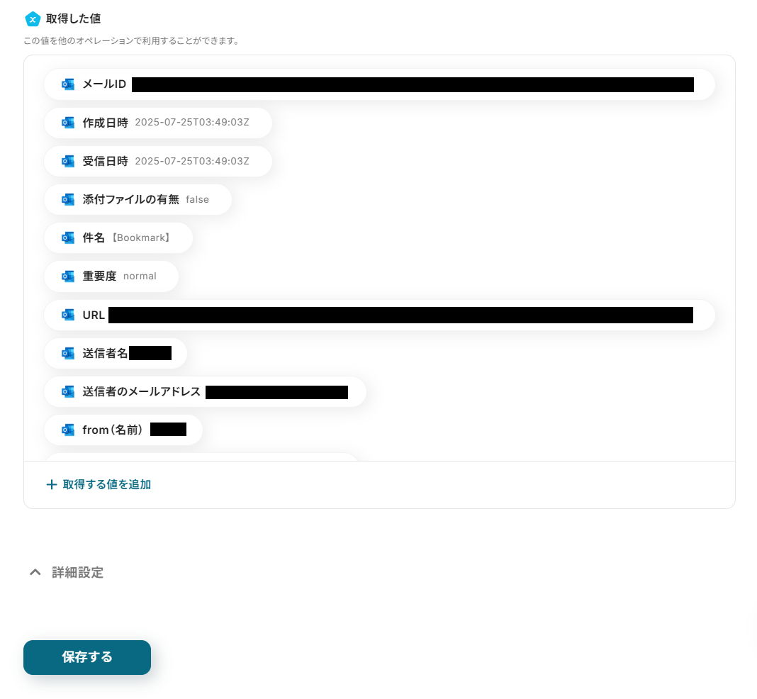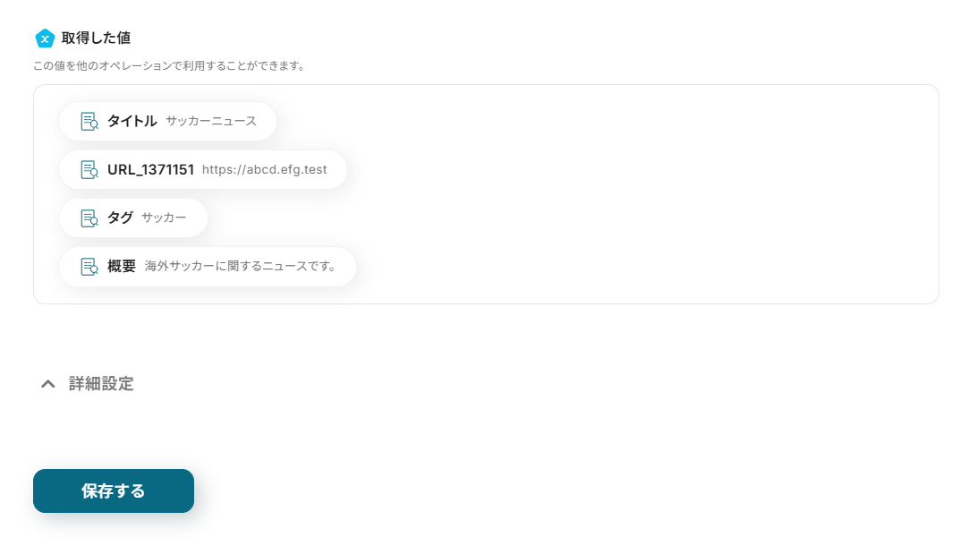 テストが成功すると、指定した項目が取得されるので、確認したら保存してください。