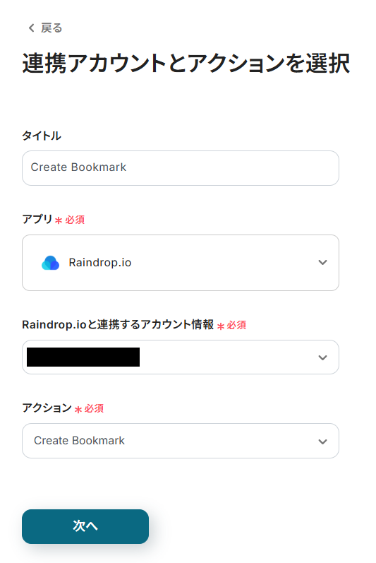 最後に、これまでのステップで取得した情報を利用して、Raindrop.ioにブックマークを作成する設定を行います。