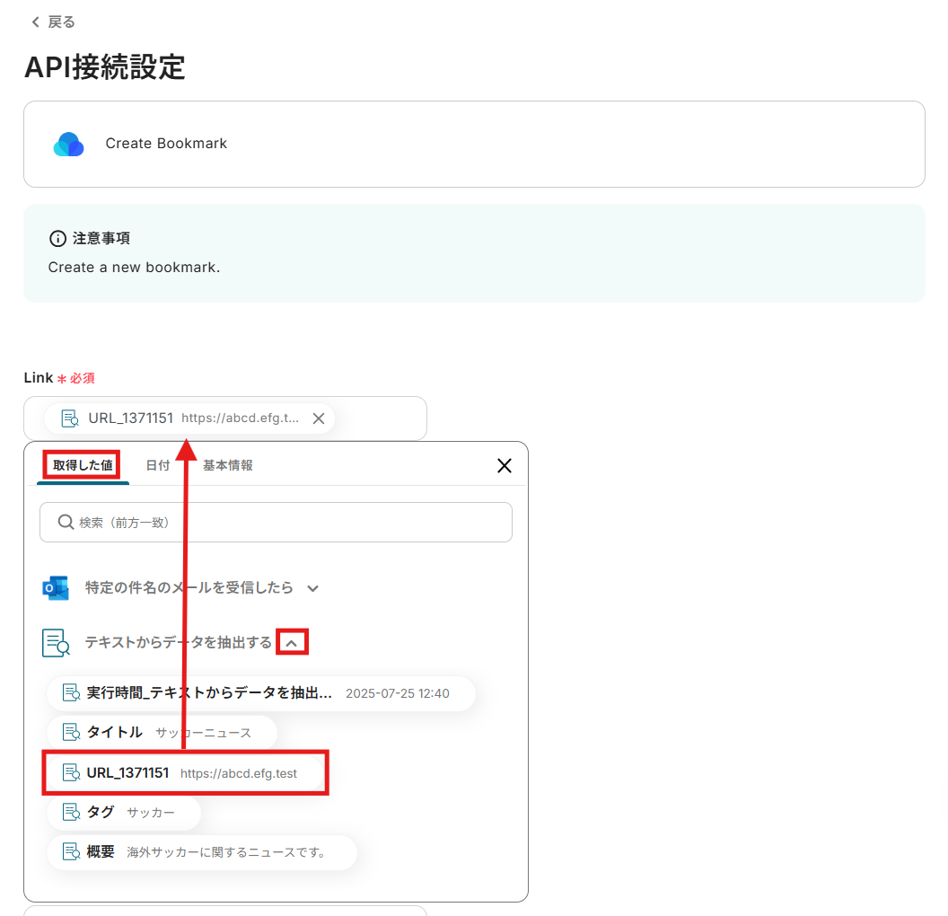 取得した値を利用することによって、受信するメールごとに変わる内容をブックマークへ動的に反映できます。