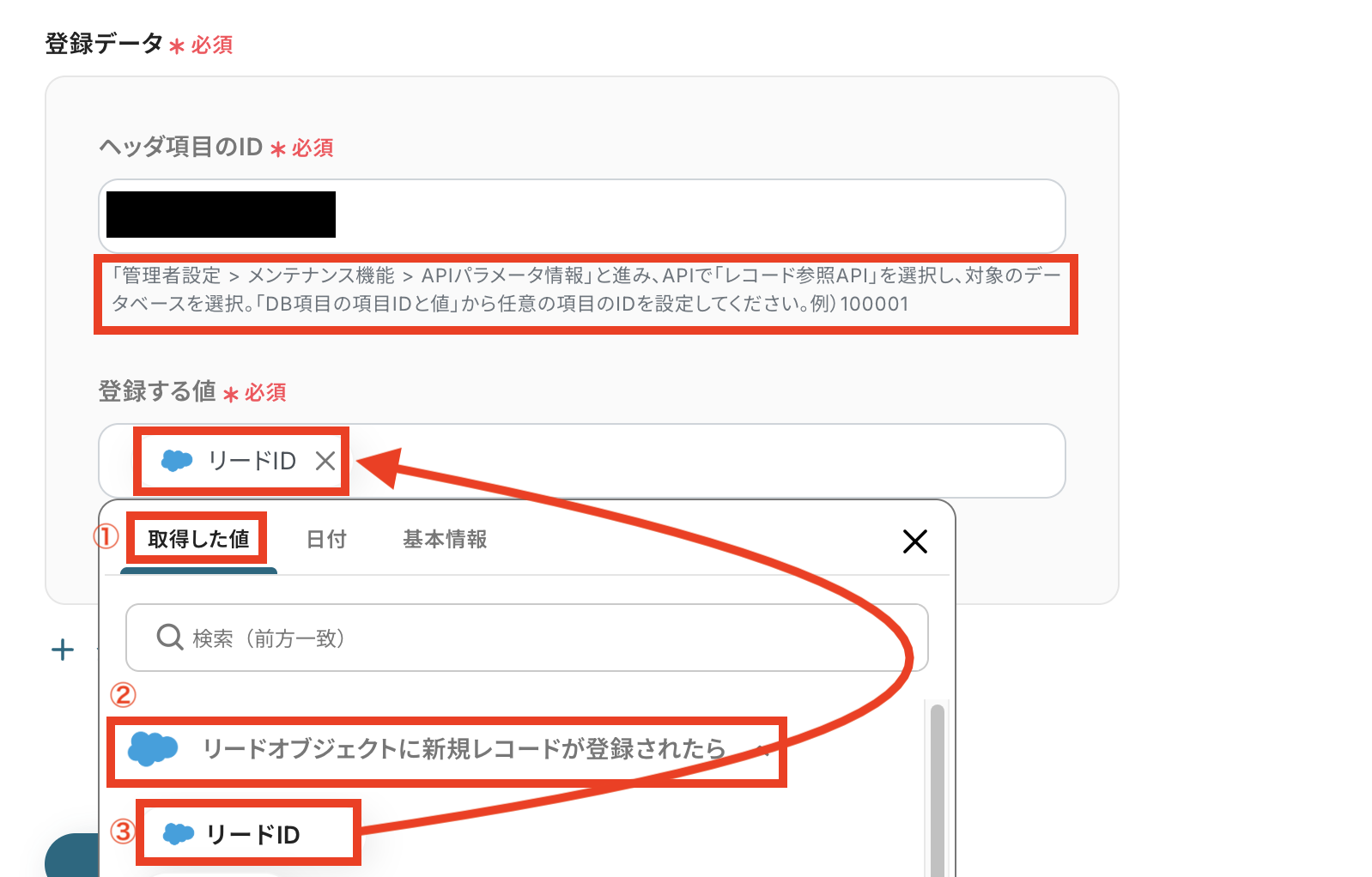 「ヘッダ項目のID」:赤枠の注釈を確認しながら設定する