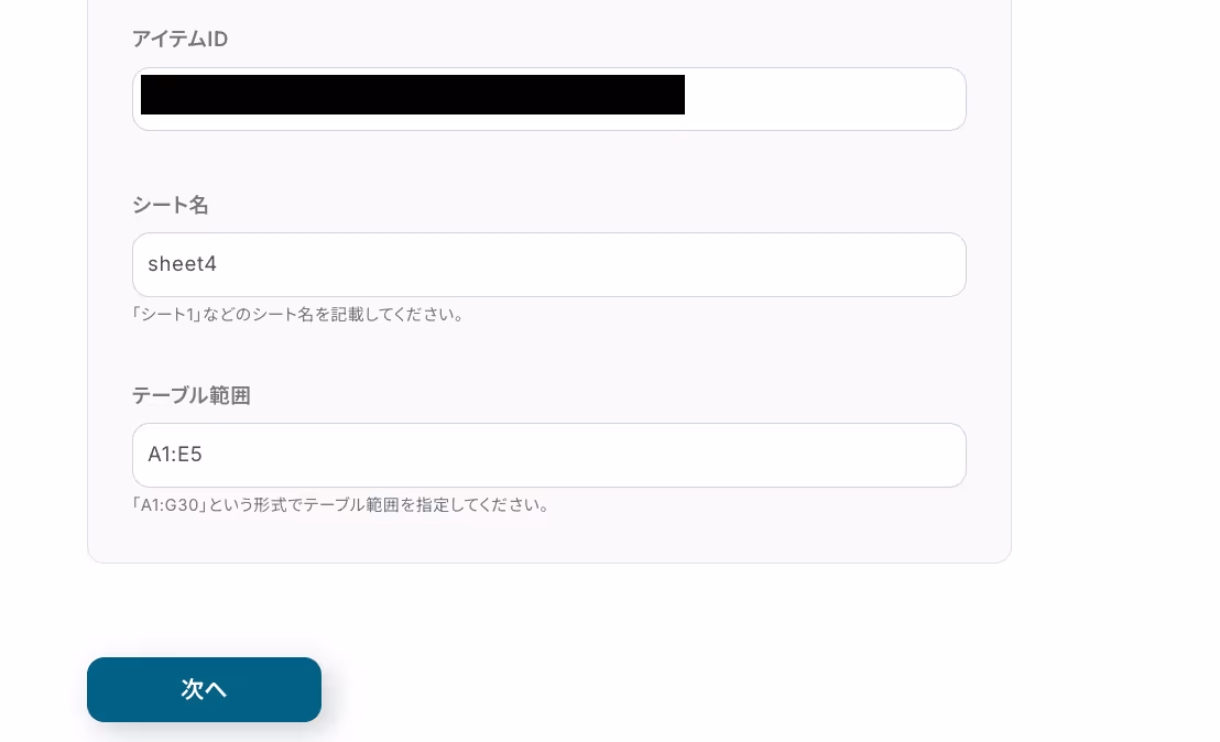 「ファイル名」は任意で設定、「アイテムID」「シート名」は候補から選択しましょう。