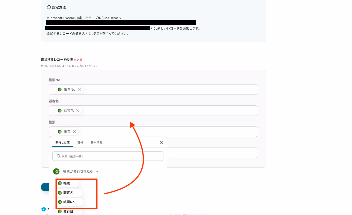 欄をクリックして、楽楽明細で取得した内容を各項目に変数として埋め込みましょう。
