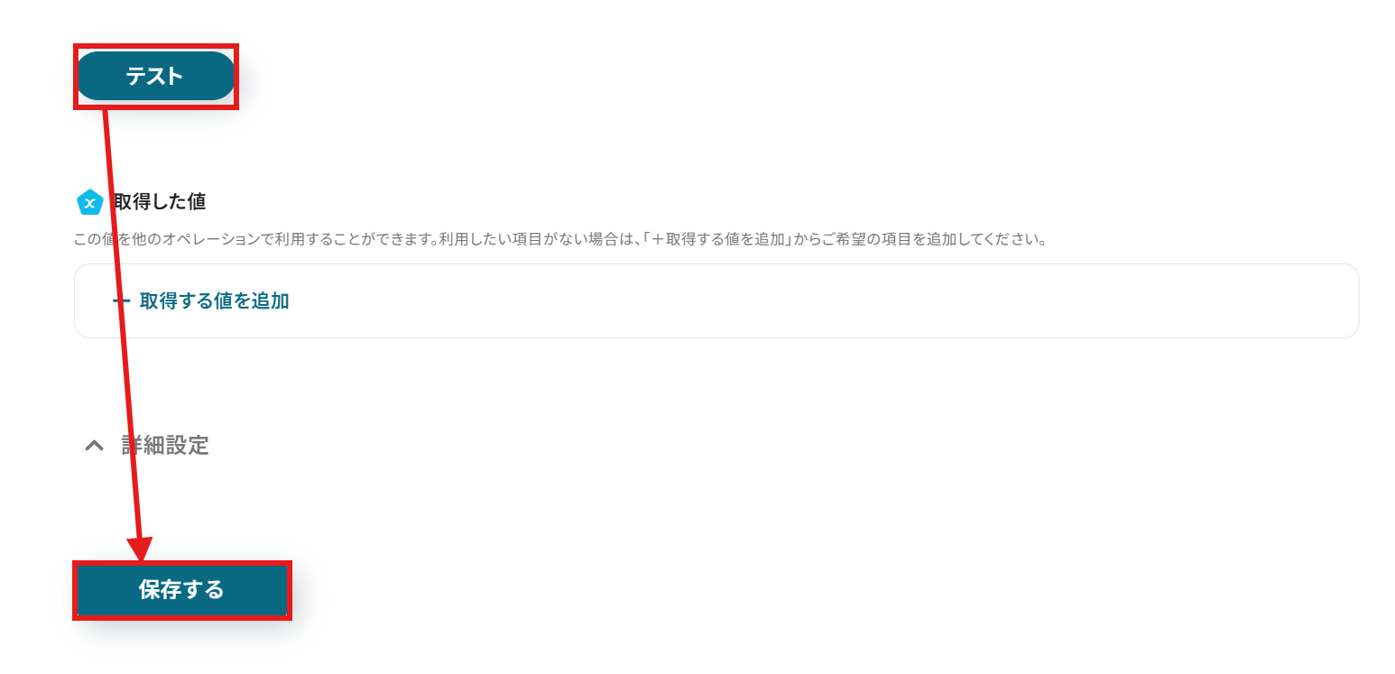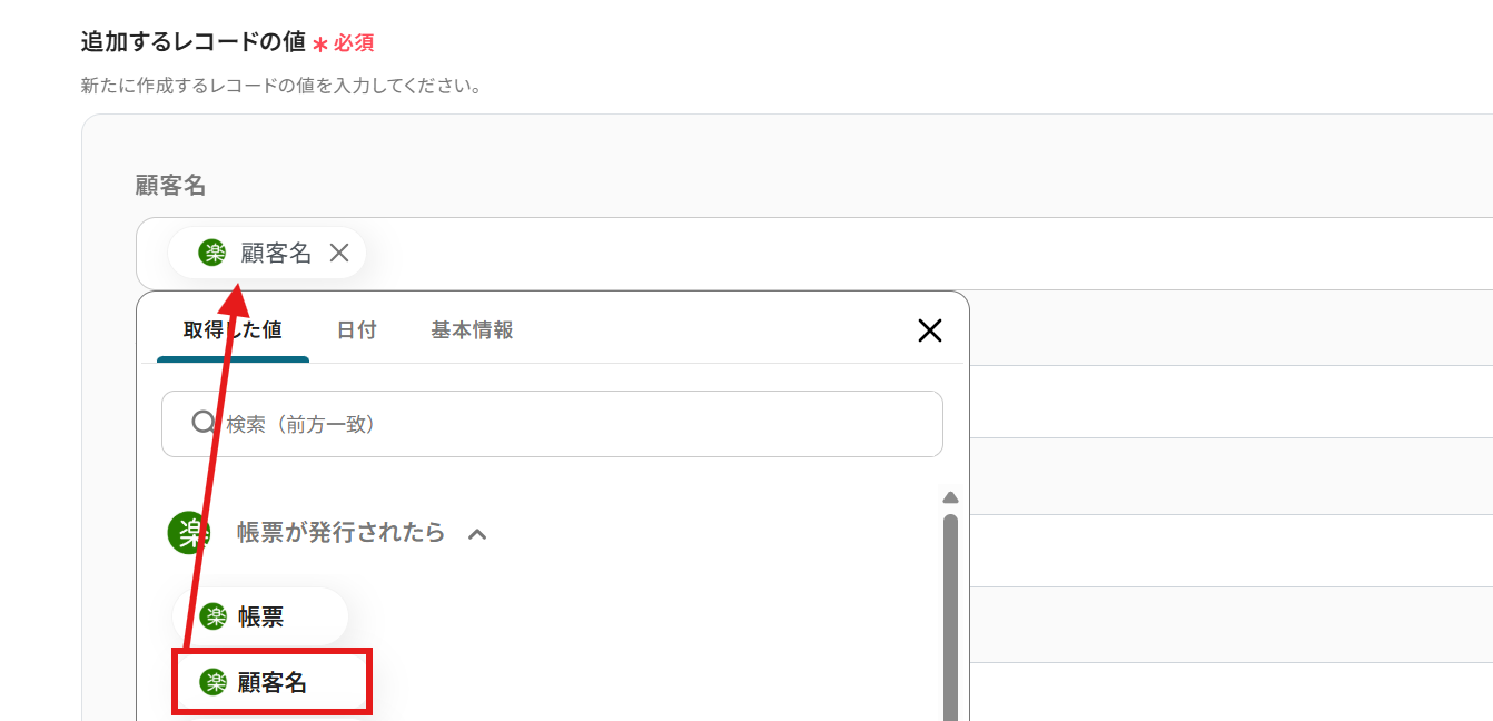 追加するレコードの値を設定していきましょう。 各項目をクリックすると、楽楽明細で取得した値を引用できます。 設定が完了したらテストをクリックしましょう。