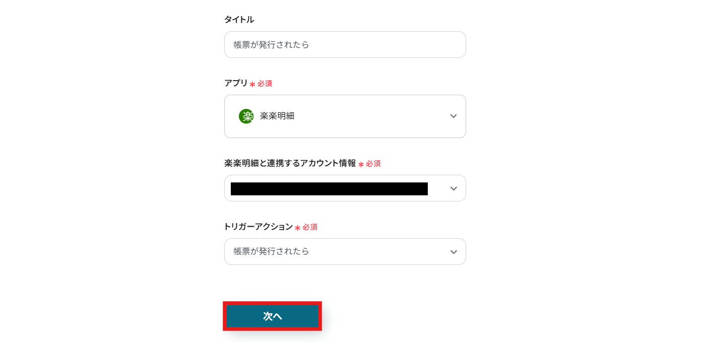 楽楽明細と連携するアカウント情報はプルダウンから選択します。 トリガーには「帳票が発行されたら」を選びましょう。 入力が終わったら、「次へ」を押して進めてください。