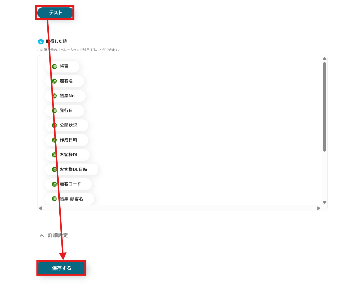 設定が終わったらテストのため、楽楽明細の画面で帳票を発行しましょう。 続いてフローボットに戻り、「テスト」をクリックします。 テストが正常に完了すると、「テスト成功」の画面が表示され、楽楽明細から取得した情報を引用できるようになります。 詳しくは以下のリンク先を参照してください。アウトプットについて テストが終わったら、「保存する」をクリックするのを忘れないようにしましょう!