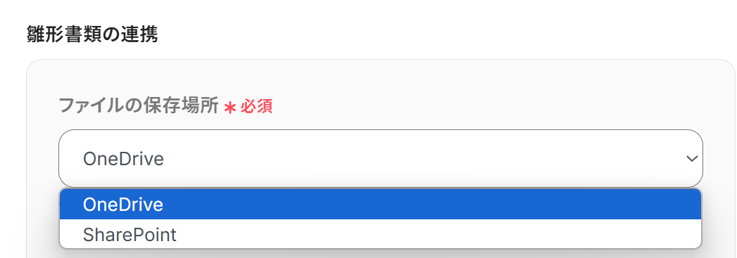 ファイルの保存場所: プルダウンで「OneDrive」か「SharePoint」か選択できます。今回は「OneDrive」を選択しています。