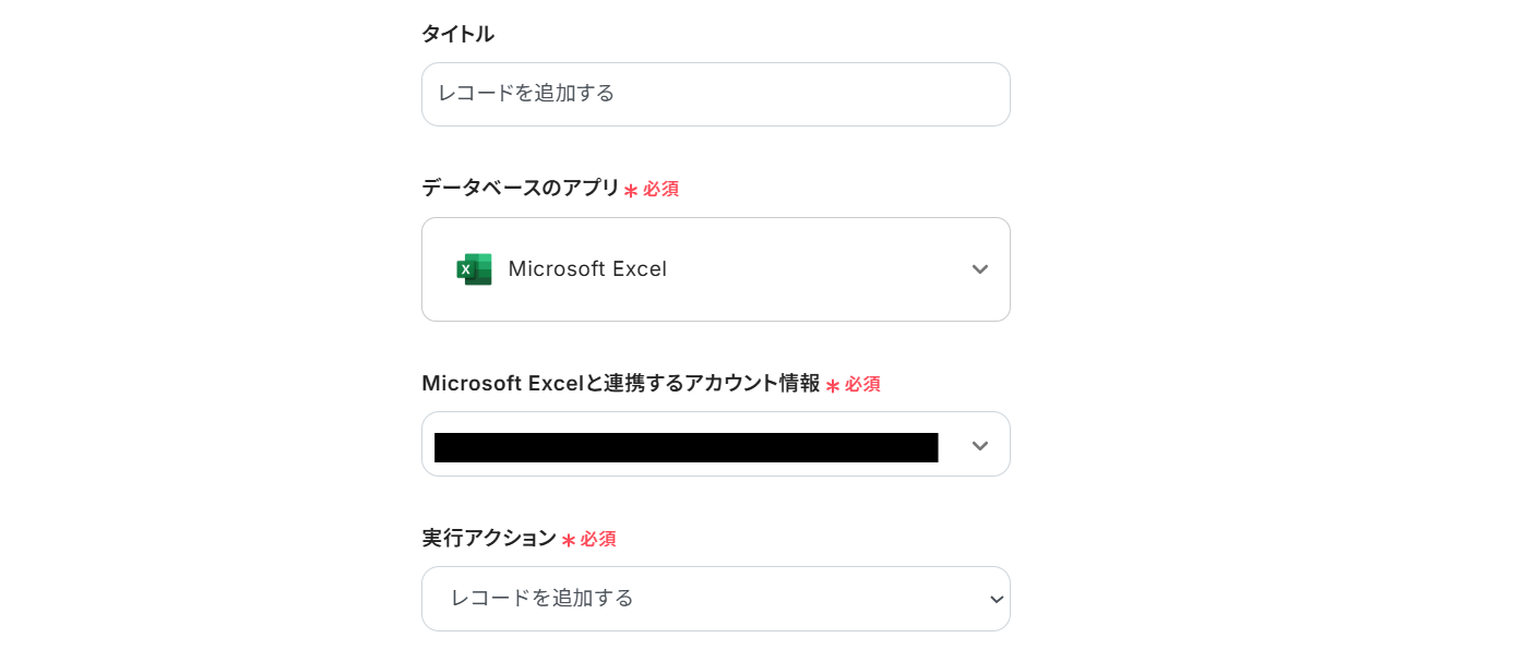 Microsoft Excelと連携するアカウント情報はプルダウンから選択します。 アクションには「レコードを追加する」を選びましょう。