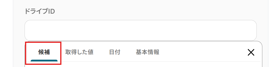 ドライブID、アイテムID、シート名: 入力欄をクリックすると以下のように候補が表示されるので、その中から選択しましょう。