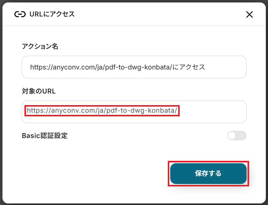 今回は操作例としてAnyConvを使用していますが、用途や社内ルールなどに応じてURLをカスタマイズして使いましょう。 「1.URLにアクセス」をクリックし、任意のアクション名と対象のURLを入力して保存することでカスタマイズできます。