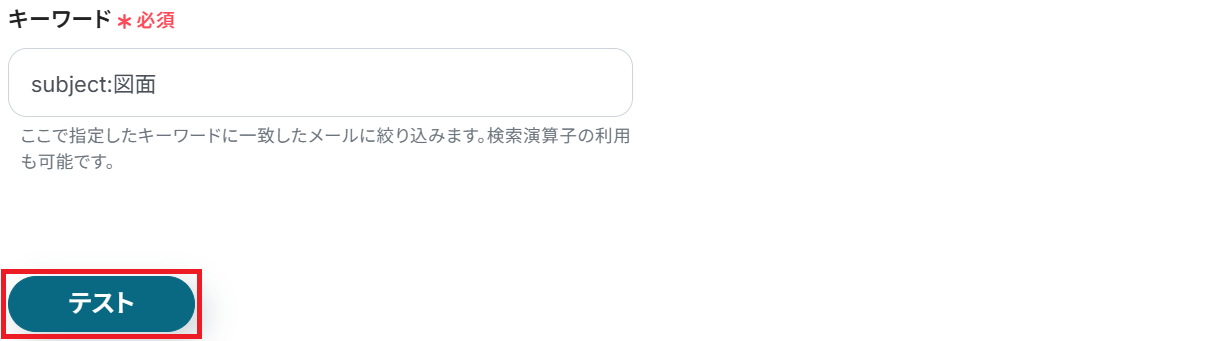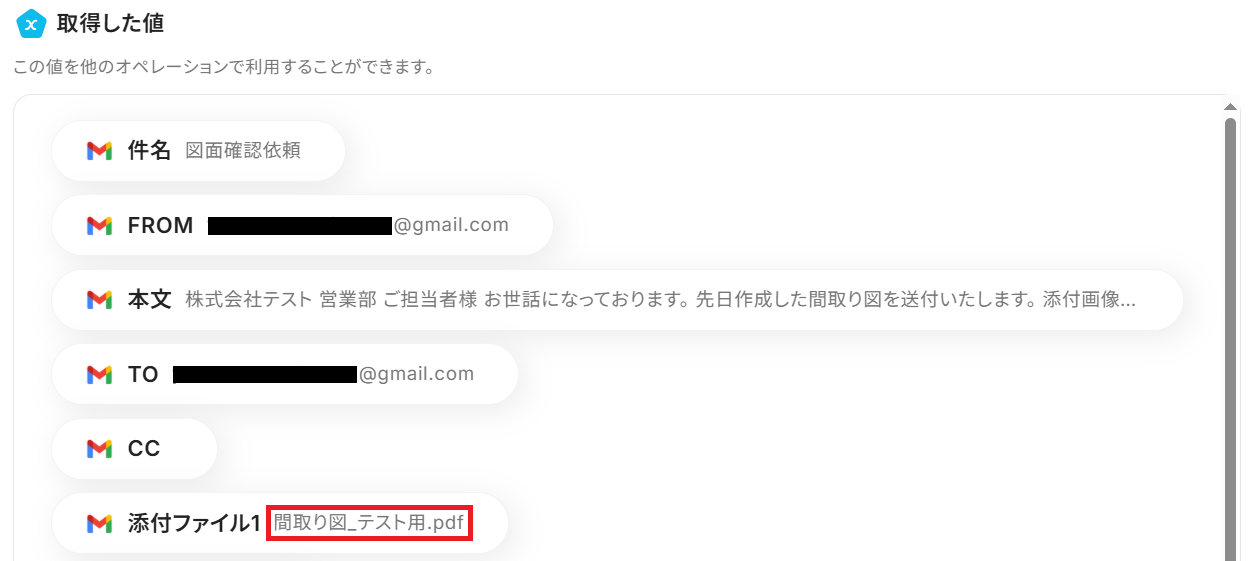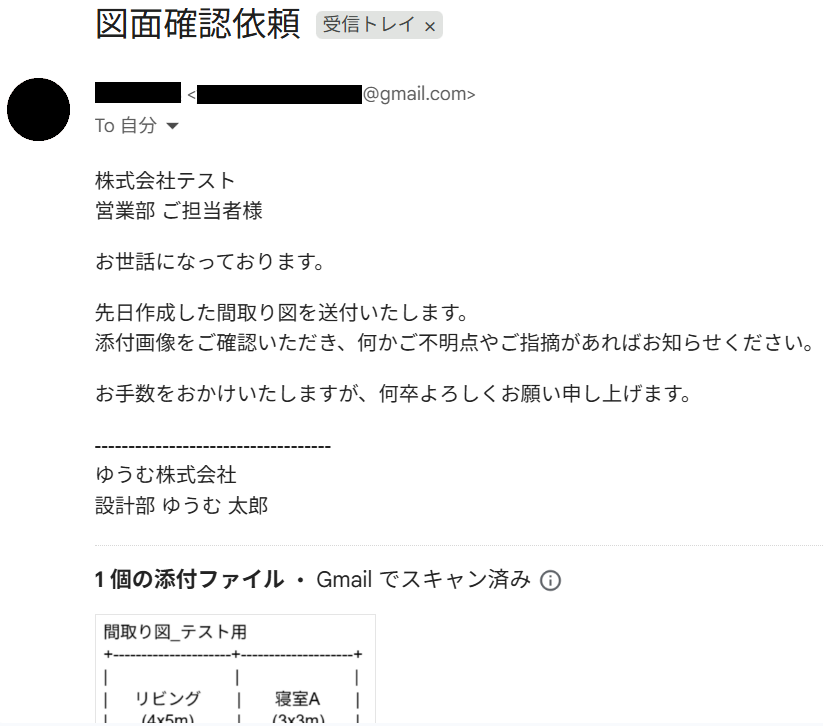 最後に、連携したGmailアドレスに上記のキーワードを含むPDFファイル付きメールを送信しましょう。 今回は以下のように、件名に「図面」というワードが入ったメールを送信しました。