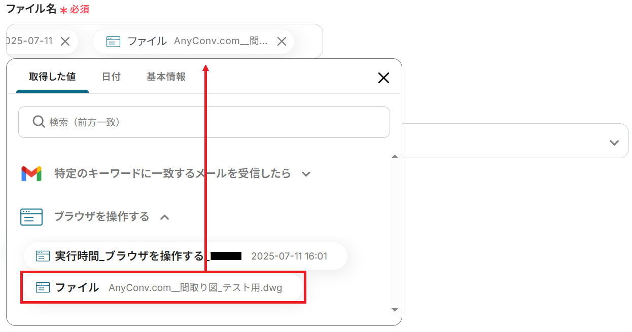 次に「ファイル名」を入力してください。日付や、ステップ4で変換したファイルのアウトプットを選択すると変数として利用できます。