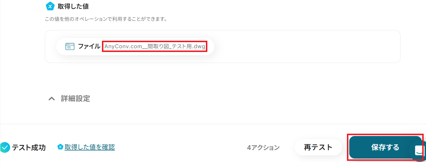 成功したら保存しましょう。ここで取得したアウトプット の値は次のステップで活用します。
