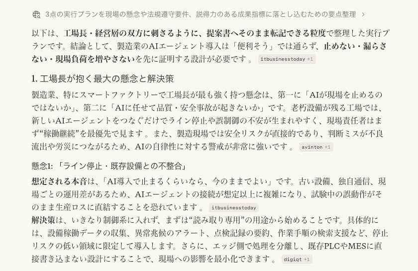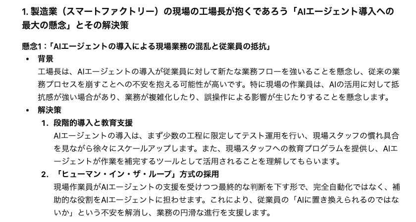 1. ターゲットを製造業(スマートファクトリー)に特化させた場合、現場の工場長が抱くであろう「AIエージェント導入への最大の懸念」を2つ予測し、その解決策を提示してください。