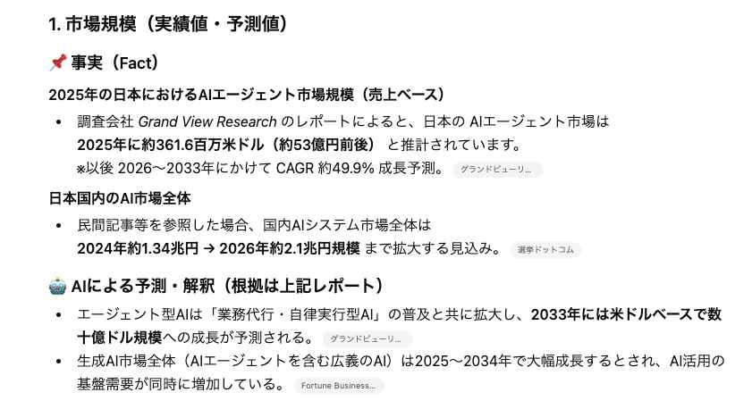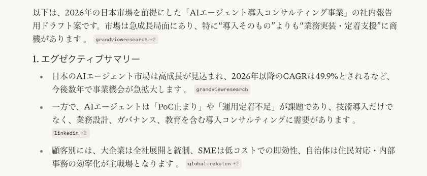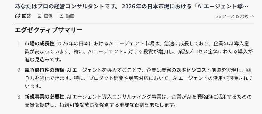一方、仕事での市場調査、競合分析、企画書の作成といった業務用途で使用する場合は、情報の正確性や多角的な視点が求められます。