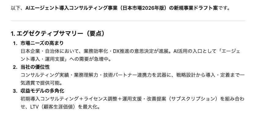 続いて、プロのコンサルタントという役割を与え、新規事業のドラフト作成を指示しました。