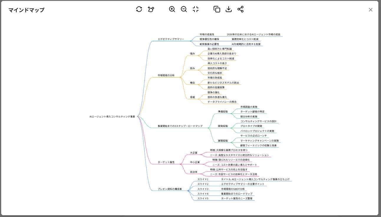 最大の特徴は、検索結果をテキストで返すだけでなく、マインドマップ化やスライド化など、情報整理までつなげやすい点です。