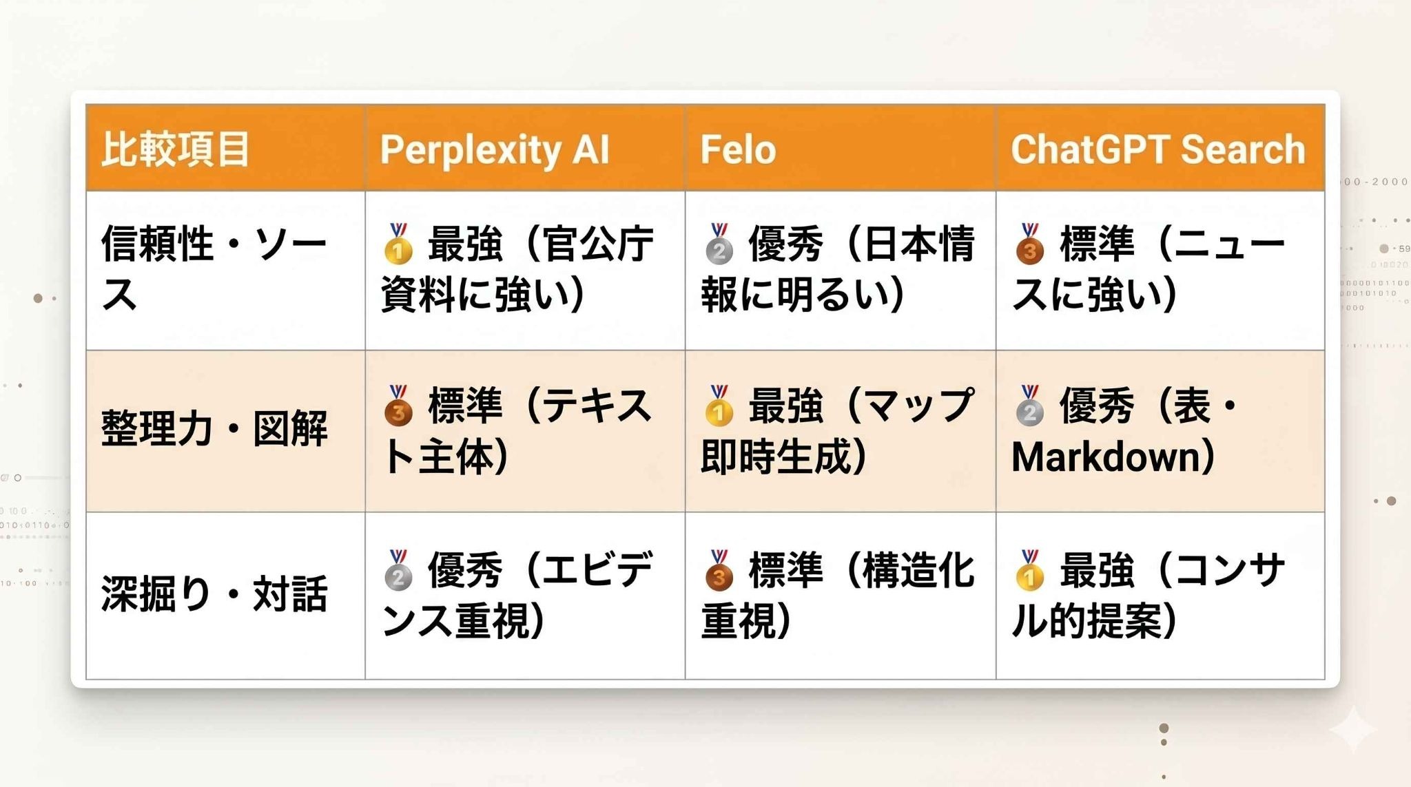 正確な数字や法規に基づく堅実なリサーチではPerplexityが使いやすく、調べた内容を図解的に整理したい場合はFeloが有力です。