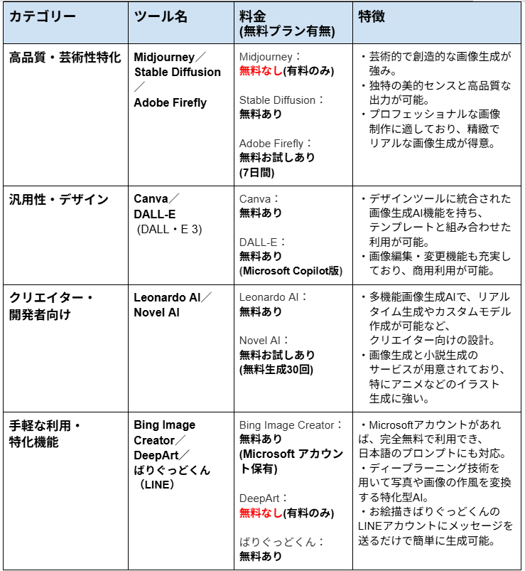 画像生成AIは、高品質・芸術性特化型/汎用性・デザイン系/クリエイター・開発者向け/手軽な利用・特化機能型といった4つのカテゴリーで利用されています。